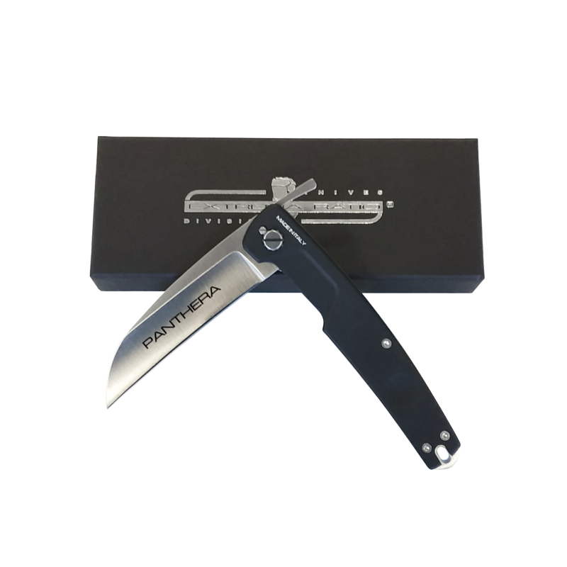 Panthera est un couteau pliant, le modèle conserve toutes les caractéristiques du T-Razor, dont il s’inspire, à la différence que la partie dorsale de la lame descend vers la pointe comme les feuilles de la falaise. Le couteau est doté du nouveau système d’ouverture à grande vitesse Razor. Disponible en version satinée et noire.
