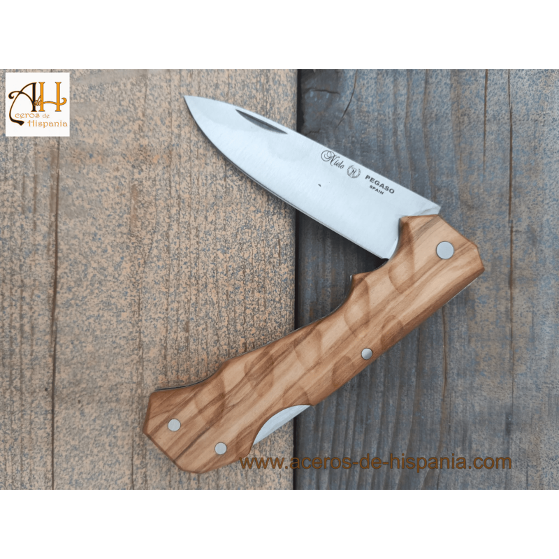 <p>- Couteau de poche Pégase.<br />- Lame : acier AN58.<br />- Manche en bois d’olivier.<br />- Longueur de la lame : 8 cm.<br />- Longueur totale : 19 cms.<br />- Poids : 96 grs.<br />- Fabriqué à Albacete (Espagne).</p>