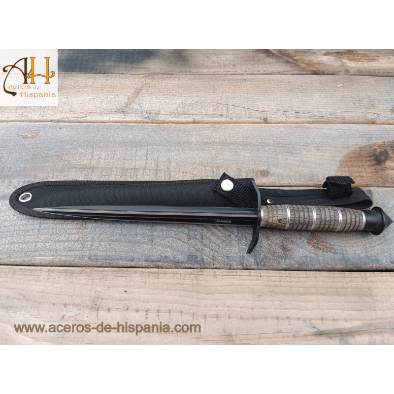 Couteau à triple lame, tranchant TRIPLEX. Il a une lame de 20,5 cm, fini en acier 3Cr13Mov noir, la lame a une épaisseur de 19,07 mm. La taille du manche est de 13,70 cm et sa finition est en aluminium et en bois. La longueur totale du couteau triplex est de 34,20 cm. Son poids est de 231,60 grammes. Comprend une housse en nylon noir.