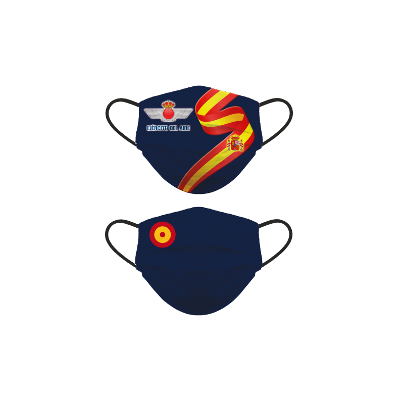 Acc. visage réversible Niveau 3<br />Modèle:<br />-Face 1 : Armée de l’air et Ban. Esp<br />-Côté 2 : Bleu et drapeau Esp <br />Composition des matières premières : 92% PES / 8% SPANDEX<br />Fonctionnalités:<br />- Nombre maximum de cycles de lavage dans lesquels la protection du masque est garantie : 25<br />- Les masques doivent être lavés à l’aide d’un cycle de lavage normal et complet à 60º avec un détergent.<br />-Ce masque doit être utilisé en complément des mesures de protection et d’hygiène recommandées dans les règles de distanciation sociale fondamentales au contrôle du Covid-19<br />REMARQUE IMPORTANTE : Les masques de niveau 2 et 3 ne sont pas encadrés comme du matériel médical ou de l’équipement de protection individuelle EPI<br />