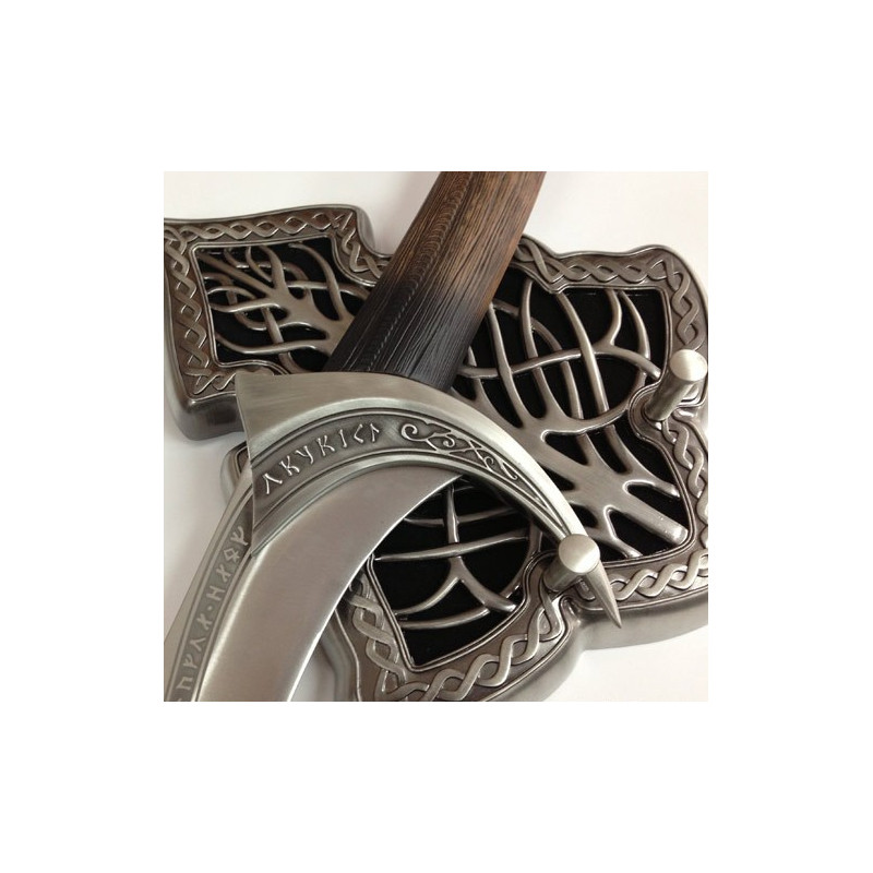 <p>La priorité était de reproduire exactement chaque détail. L’épée mesure près d’un mètre de long et possède une lame en acier inoxydable, qui est pourvue d’une inscription runique gravée. Les sections de la poignée sont constituées de pièces métalliques solides, d’imitations de pierres précieuses et d’une poignée en résine acrylique. L’épée est livrée avec un bouclier décoratif en bois et un certificat d’authenticité. Détails : • Longueur totale : 98,5 cm • Longueur de la lame : environ 65,5 cm • Matériau de la lame : acier inoxydable AUS-6 • Matériau du manche : résine acrylique • Comprend une plaque murale décorative en bois dur. - Chaque épée est accompagnée d’un certificat d’authenticité.</p>