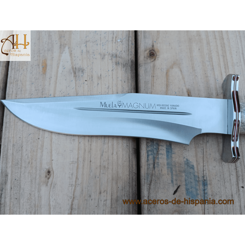 Couteaux Magnum Muela . Ce couteau de chasse et de sport modèle Muela bowie Magnum-23.TO, possède une lame de 230 mm en acier X50CrMoV15 d’une dureté de 57-58 HRC. Il a une poignée en bois de cerf d’une longueur de 130 mm, le garde-boue est en laiton. Il a une longueur totale de 360 mm et un poids de 420 grammes. Comprend un étui en cuir marron de qualité supérieure. Ce couteau de chasse est associé au savoir-faire des couteliers experts Muela.
