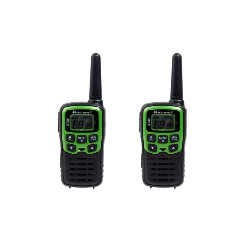 TALKIE-WALKIE MIDLAND XT30<br /><br />La ligne XT est une solution idéale pour ceux qui veulent parler à la fois professionnellement et pendant leur temps libre.<br /> <br />Caractéristiques<br />16 canaux (8 PMR + 8 préprogrammés)<br />38 teintes CTCSS en TX et RX<br />Portée jusqu’à 6 km<br />Port microUSB pour la recharge<br />Prise Midland 2 broches pour SPK/MIC ?<br />Tonalité latérale : Silencieux de bruit de fin de transmission<br />Fonction SCAN<br />Fonction CALL<br />Fonction VOX pour des conversations mains libres <br /> <br />La boîte comprend<br />Vert<br />2 rayons avec clip de ceinture<br />6 piles rechargeables AAA (jusqu’à 5h)<br />Câble USB-microUSB