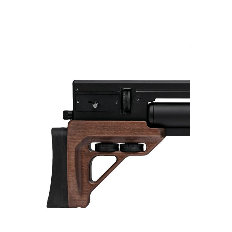 <p> Barillet de 600 mm avec modérateur de son intégré.</p> <p> Culasse avec système de porte-chargeur et joues inclus.</p> <p> La bouteille d’air a une pression de service maximale de 300 bars et peut contenir jusqu’à 500 cc d’air. Le cylindre est en fibre de carbone.</p> <p> Ce modèle est équipé d’un régulateur de pression qui assure une puissance et une vitesse constantes à chaque coup. Manomètre inclus situé sur le côté droit.</p> <p> Rail Weaver de 22 mm</p> <p> La sécurité manuelle est située au-dessus du pontet.</p> <p> Le tout nouvel indicateur vous permet de savoir que l’arme est chargée.</p> <p> Nouveau système d’actionnement avec levier latéral commutable, qui permet une action en douceur lors de l’assemblage de la carabine.</p> <p> Canon à armement froid équipé du filetage 1/2 UNF.</p> <p> Système de prise de vue, multi-coups. Gâchette réglable à deux temps.</p> <p> Puissance réglable</p> <p> Verrouillage manuel (système PIN)</p> <p> Longueur totale : 840 mm (33,1 po)</p> <p> Poids sans viseur : 3,8 kg (8,3 lb)</p> <p> La carabine est fournie avec deux chargeurs multi-coups d’une capacité de 14 balles par chargeur, un connecteur de charge et un kit de joints toriques.</p>
