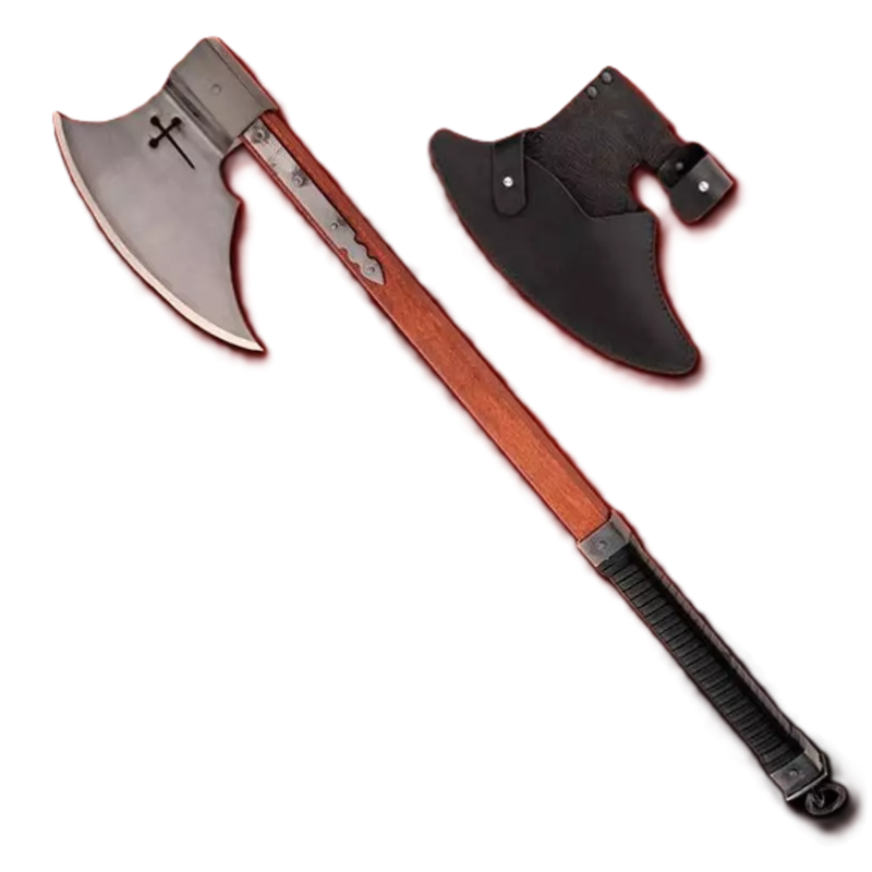La hache était l’arme de poing de prédilection du chevalier médiéval, notamment pendant les croisades. Cette arme robuste est dotée d’une grande lame savamment aiguisée percée d’une grande croix. La lame a été rivetée à la tige en bois dur et possède des languettes des deux côtés pour une protection supplémentaire. Le manche a été lissé et doublé de cuir lisse noir. Toutes les pièces métalliques ont été noircies, y compris les anneaux pendants en bas.
