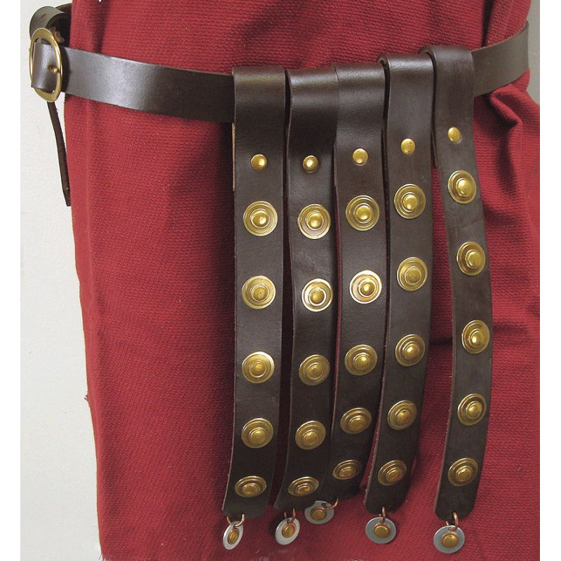Cette ceinture romaine, connue sous le nom de Cinculum Militaire, est principalement ornementale. Ce type de ceinture était largement utilisé par les soldats de l’armée romaine pour ceindre leur tunique et accrocher leurs armes. Il s’agissait d’une ceinture en cuir clouté et ornée de ptéryges ou de protections de l’aine qui consistaient en un nombre variable de bandes suspendues qui étaient parfois des disques et des anneaux métalliques très décorés. Son importance était telle qu’il est devenu un signe distinctif des soldats romains qui le portaient fièrement, qu’ils portaient des armes ou non, et indiquaient leur statut militaire.<br /><br />Notre conception est basée sur un original très populaire datant de 100 après JC environ.<br /><br />Fabriqué en cuir brun de qualité supérieure.<br />Un must-have pour tout soldat romain.<br />Design authentique.<br />Convient aux tailles jusqu’à 117 cm<br />Fabriqué par Windlass Steelcrafts®