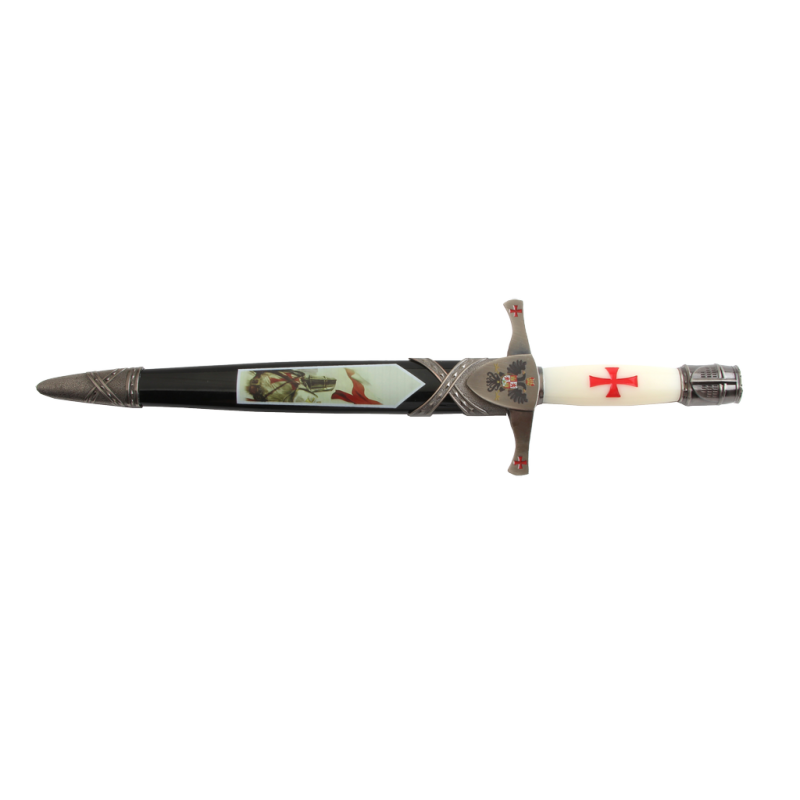 Dague templière 16761-1, le pommeau et la garde sont de couleur nickel, avec une poignée blanche et une croix templière rouge. La taille totale est une lame en acier de 40,5 cm. Le fourreau est noir avec des finitions nickel et un apprêt d’un Templier. Réf. 16761-1