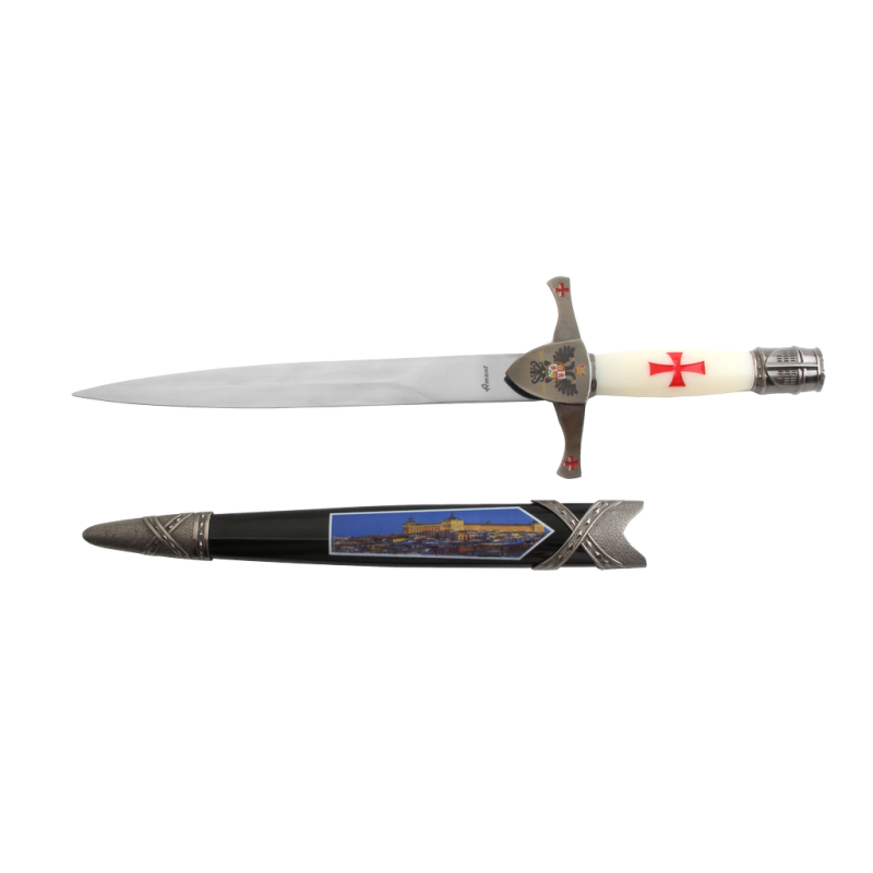 Dague 16761-2 Templaria, le pommeau et la garde sont de couleur nickel, avec une poignée blanche et une croix des Templiers rouge. La taille totale est une lame en acier de 40,5 cm. Le fourreau est noir avec des finitions en nickel et un apprêt de l’Alcazar de Tolède. Réf. 16761-2