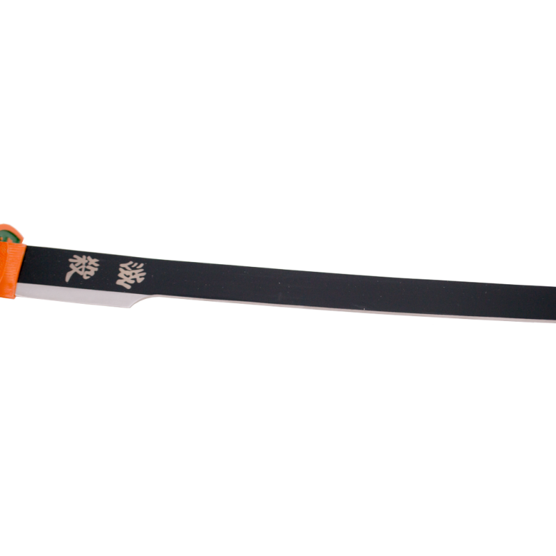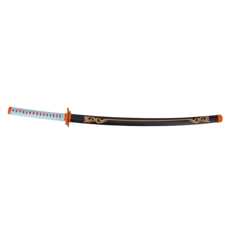 Demon Slayer Katana S0246 manié par Kochou Shinobu, réplique non officielle, lame en acier de 101 cm, manche cordé bleu ciel avec simili cuir rayé orange, fourreau gravé. Réf. S0246