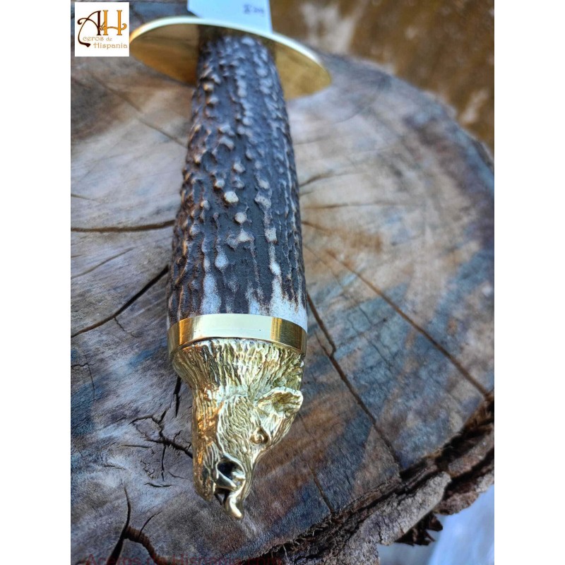 Sa poignée authentique en bois de cerf offre une prise en main confortable et sûre, tandis que la double protection en laiton protège la main à chaque utilisation. Le détail le plus distinctif est son pommeau en forme de tête de sanglier en laiton, symbole de la chasse au gros gibier.