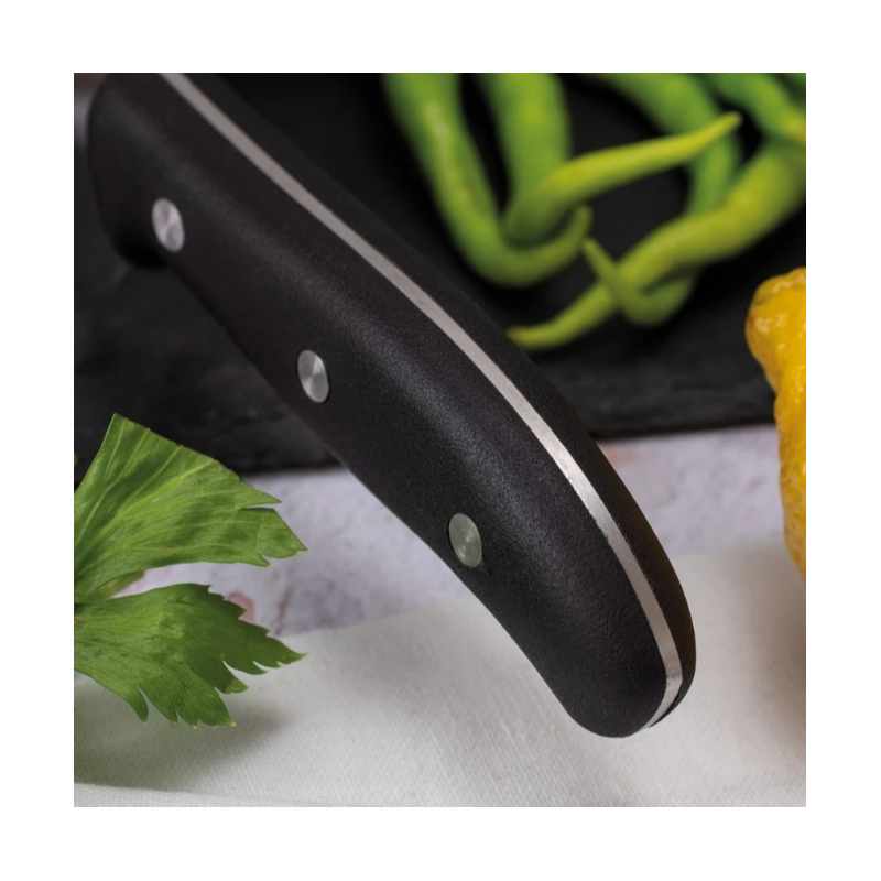 <p>-Couteau de cuisine.<br />- Acier inoxydable, molybdène vanadium.<br />- Polissage mat.<br />- Poignée en POM, polyoxyméthylène.<br />-Lave-vaisselle.<br />- Présenté dans une pochette en feuille.</p>