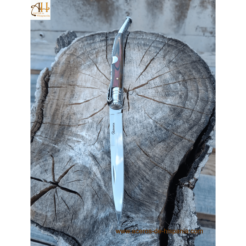 Couteaux à talons aiguilles. Ce couteau à talon aiguille Albainox est doté d’une lame de 9,80 cm en acier 3Cr13Mov avec une finition miroir et une épaisseur de 1,60 mm. Il a une poignée de 13 centimètres, finie en endurance rouge. La longueur totale du couteau est de 22,80 cm.