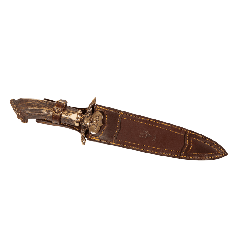 Le manche exquis de 5 3/4 pouces (14,50 cm) est fabriqué à partir de bois de cerf, offrant un sens inégalé de la qualité et de la tradition. La garde en laiton, ornée d’une fine figure de cerf, ajoute une touche distinctive et raffinée à l’esthétique de ce couteau unique. D’une longueur totale de 39,50 cm, chaque aspect de cette pièce a été soigneusement conçu.