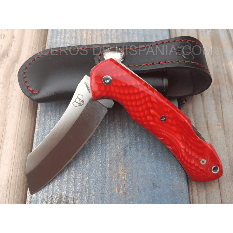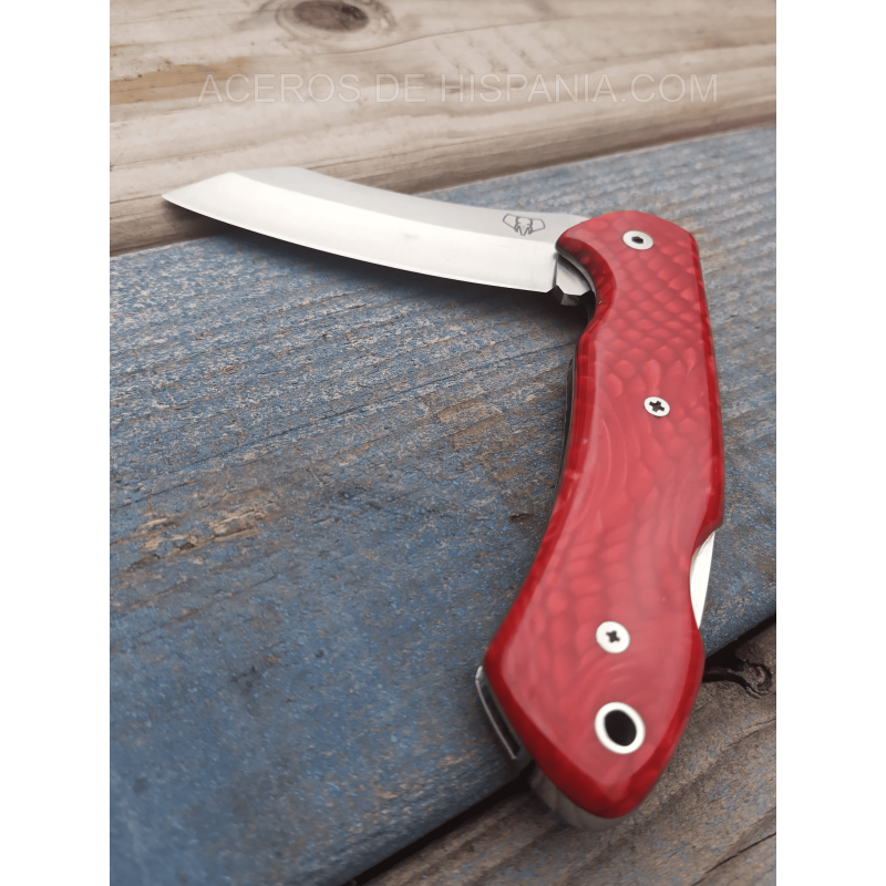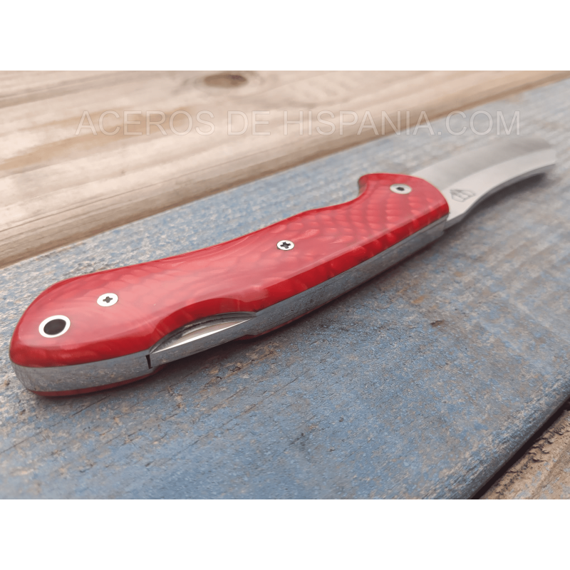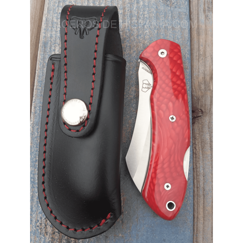 La poignée est fabriquée en Juma Roja, un matériau synthétique d’une grande beauté qui simule les veines naturelles, donnant un look exclusif et sophistiqué. Chaque pièce est unique, car le motif du grain peut varier, ce qui fait de chaque couteau un travail non remplaçable. Son système de verrouillage confortable assure la sécurité pendant l’utilisation, et le design ergonomique de la poignée, 10,5 cm, assure une prise en main ferme et confortable.