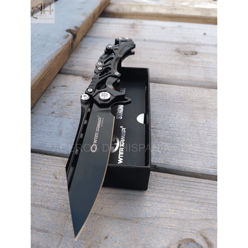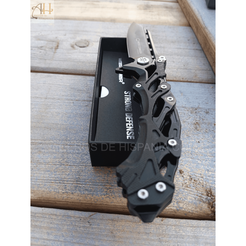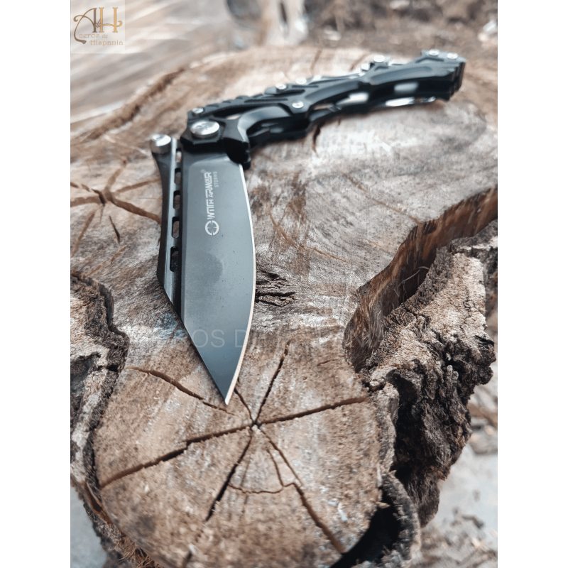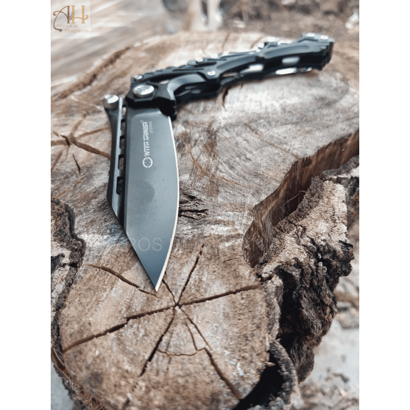 Couteaux de poche tactiques Witharmour. Il a une lame de 10,10 cm et une épaisseur de 3 mm. Acier de type D2 avec revêtement antireflet noir. Il a une poignée en acier inoxydable et sa longueur est de 13,30 cm. La longueur totale du couteau est de 23,40 centimètres. Il est très léger, pesant 150 grammes.