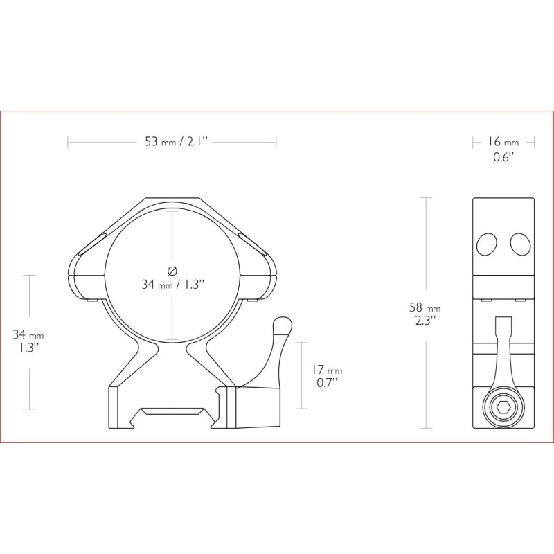 <p>Modèle moyen</p> <p>Taille de l’anneau (diamètre) 34 mm</p> <p>Tisserand de rails</p> <p>Configuration en 2 parties</p> <p>Fixations (Haut) Double Torx (T15)</p> <p>Fil (haut) 6-48</p> <p>Fixations (rail) Levier</p> <p>Filetage (rail) 8-32</p> <p>Coussin intérieur Non</p> <p>Goupille d’arrêt de recul rétractable Non</p> <p>Hauteur 2.3" 58mm</p> <p>Poids 8oz 226g</p>