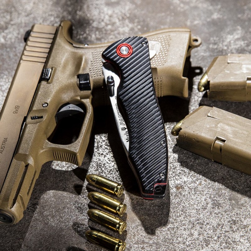 <p>Couteau Muela Panzer 10-BM.</p> <p>Couteau tactique ou de sport avec des poignées en micarta noir texturé pour faciliter la prise en main, des entretoises rouges et des détails rouges sur le matériel.</p> <p>Lame en acier au carbone D2 d’une dureté de 59-61 HRC.</p> <p>Serrure de doublure</p> <p>Bouton de pickguard avec trou pour cordon</p> <p>Trombone.</p> <p>Ouverture d’une seule main grâce à sa patte et sa nageoire.</p> <p>Comprend une housse en cordura.</p>