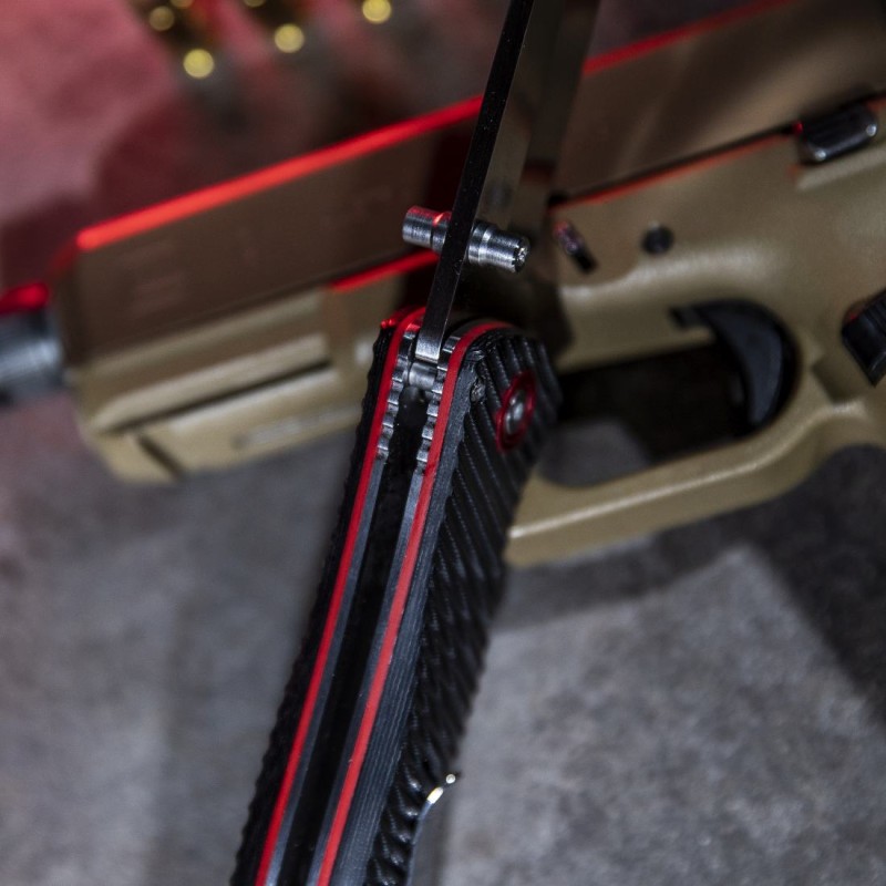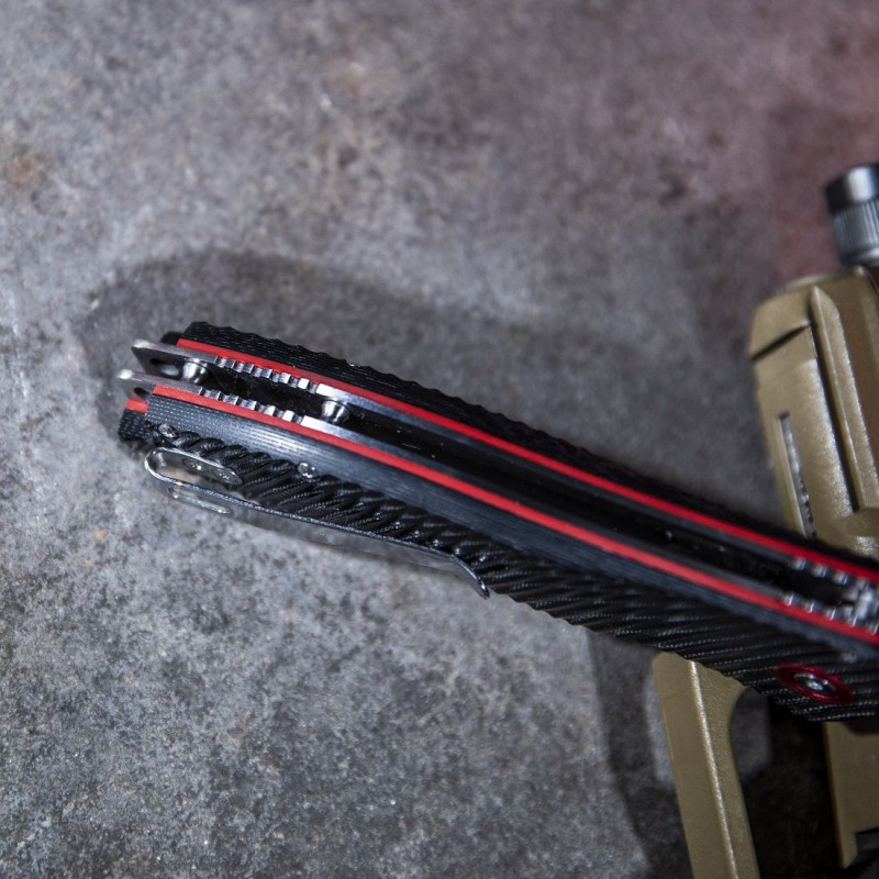 Couteau tactique ou de sport avec des poignées en micarta noir texturé pour faciliter la prise en main, des entretoises rouges et des détails rouges sur le matériel.