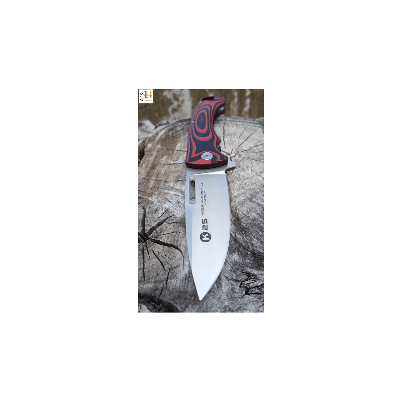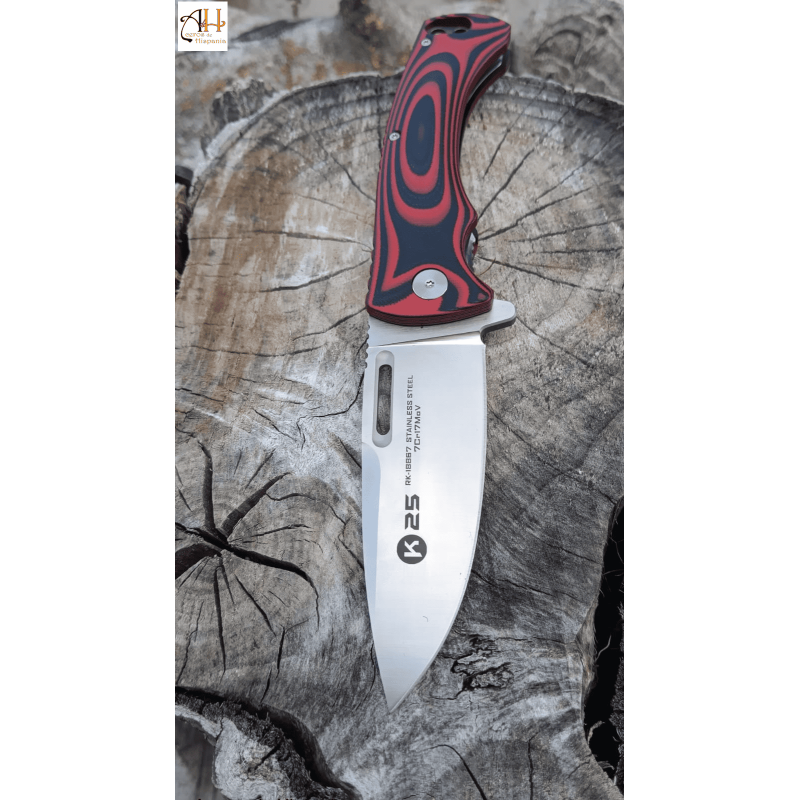 Le design du couteau K25 est complété par ses poignées G10, qui simulent l’aspect du bois de wengé rouge. Ce matériau offre non seulement une prise en main sûre, mais ajoute également une touche esthétique qui le distingue des autres couteaux du marché. La combinaison des couleurs rouge et noir lui donne un caractère moderne et élégant.