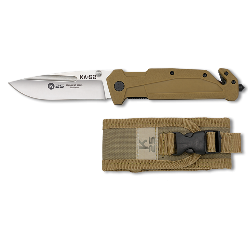 <p>K25 couteau de sauvetage KA-52 manche caoutchouté couleur coyote.</p>