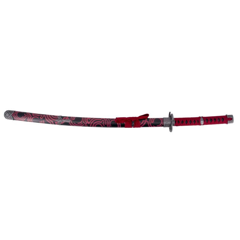 <p>Katana du jeu vidéo The Legend of Zelda du clan Sheikah, réplique non officielle.</p> <p>Lame en acier avec trous et motif en coupe satinée noire. Etau en simili cuir noir à motif violet.</p> <p>Poignée en cordon bordeaux et simili cuir à rayures noires.</p> <p>Avec support.</p> <p>Modèle : S0344</p> <p>Taille totale : 102 cm</p> <p>Taille de la lame : 66,5 cm</p> <p>Épaisseur de la lame : 3,6 mm</p> <p>Poignée : Filaire</p> <p>Poids : 1008 gr</p>