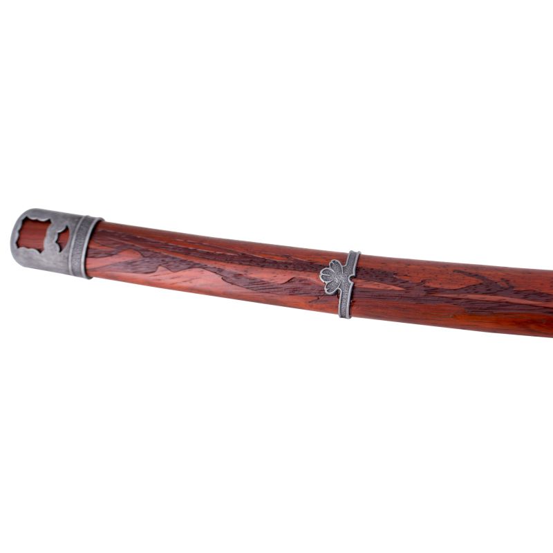 <p>Katana du jeu vidéo Sekiro Shadows die Twice, réplique non officielle.</p> <p>Lame en acier au carbone 1045 finie grenat.</p> <p>Etui en bois rouge avec gravures. </p> <p>Poignée filaire noire et simili cuir à rayons rouges.</p> <p>Avec support.</p> <p>Taille totale : 103 cm</p> <p>Taille de la lame : 70,5 cm</p> <p>Épaisseur de la lame : 7,5 mm</p> <p>Poignée : Filaire</p> <p>Poids : 1576 gr</p> <p>Modèle : S0315H</p>
