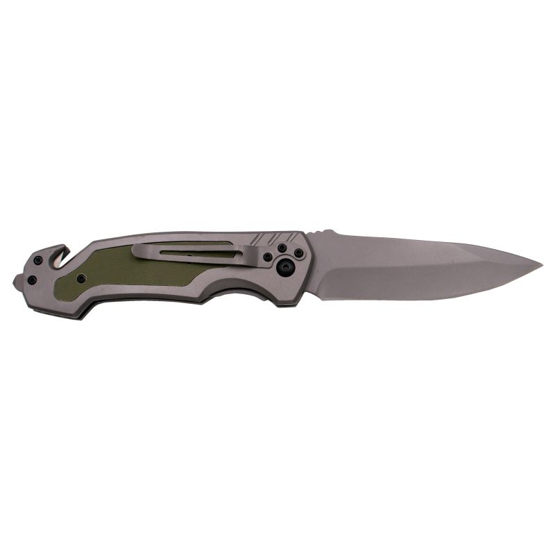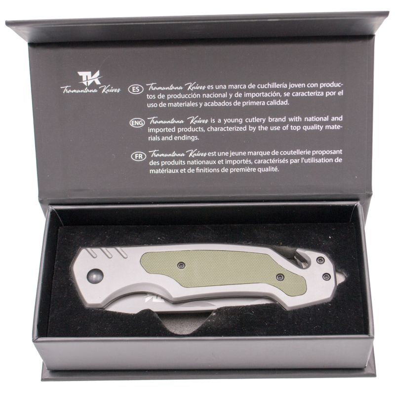 Tramuntana Knives Couteau de sauvetage N84V manche en acier plaqué titane gris avec insert G10 vert texturé, lame en acier 420 plaqué titane gris de 9,6 cm, lame de verrouillage de doublure. Il dispose d’une scie à câble et d’un brise-verre. Avec clip. Avec boîte de présentation. Réf. N84V