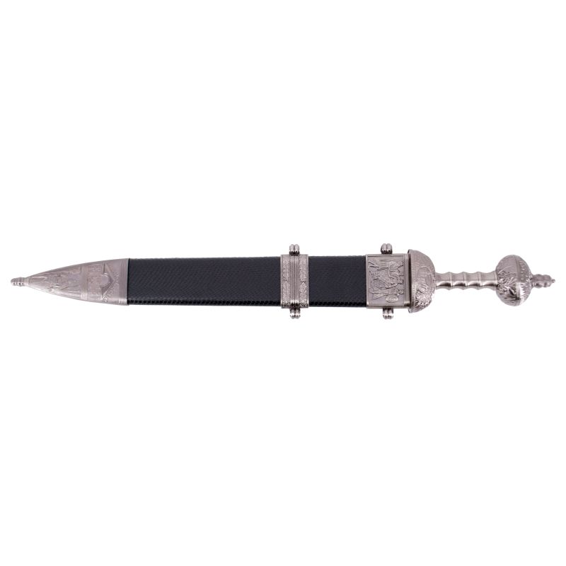 Épée Gladius finie en nickel et fourreau en noir, d’une taille totale de 100 cm avec lame en acier.