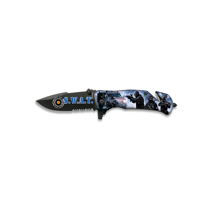 <p>Couteau de sauvetage SWAT Albainox 18136. </p> <p> <p>Couteau de poche 3D </p> <p>Marque : ALBAINOX </p> <p>Taille de la lame : 8,20 cm</p> <p>Taille de la poignée : 11.20 cm </p> <p>Taille totale :19.40 cm</p> <p>Type d’acier : 3CR13MOV </p> <p>Type de lame : Normale</p> <p>Finition : Noir </p> <p>Avec une scie</p> <p>Épaisseur de la lame : 2,73 mm</p> <p>Type/Couleur de la poignée : Aluminium / Impression 3D</p> <p>Clip-On</p> <p>Teton</p> <p>Avec coupe-bande une lame</p> <p>Briseur de verre en acier</p> <p>Type de serrure : Liner Lock</p> <p>Poids : 125 grs </p>