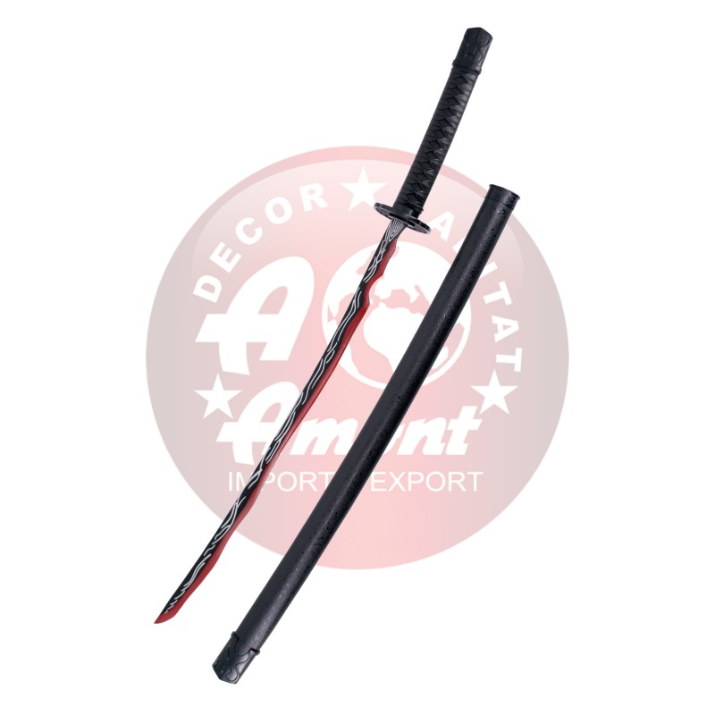 <p>Katana Katana River’s Blood from Elden Ring, réplique non officielle, lame en acier de 103,5 cm finie en noir avec des détails rouges et blancs, avec fourreau noir et poignée en similicuir noir.</p> <p> <p>Type d’acier : Acier inoxydable</p> <p>Taille totale : 103.5 cm</p> <p>Taille de la lame : 64,5 cm</p> <p>Épaisseur de la lame : 4,4 mm</p> <p>Poignée : Filaire</p> <p>Poids : 995 gr</p> <p>Avec soutien</p>