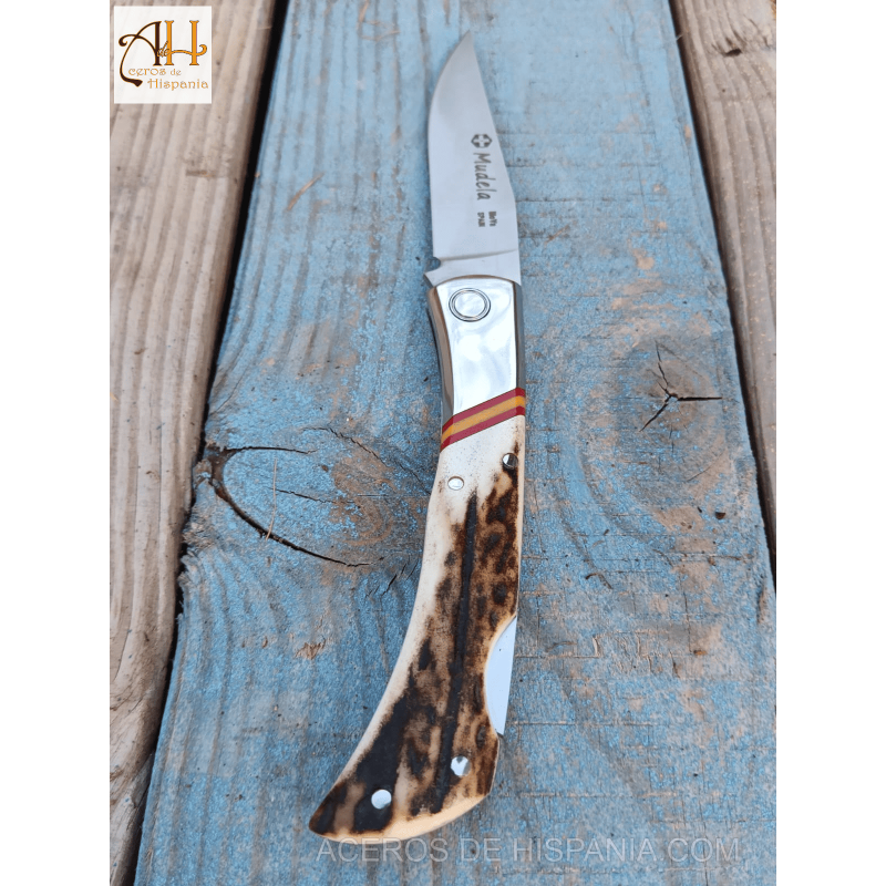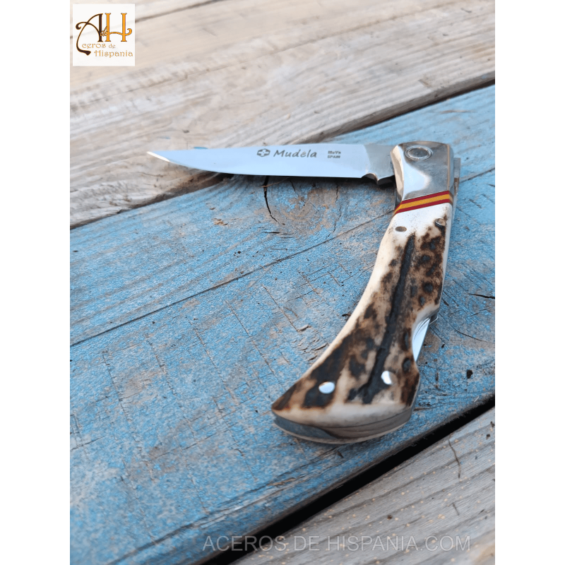 Poignée en bois de cerf authentique, avec le drapeau de l’Espagne incrusté dans les poignées.