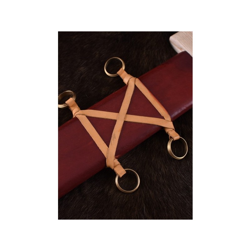 <p>Grec Xifos, épée hoplite avec fourreau</p> <p></p> <p>- Matériau : lame en acier à ressort EN45 (acier au carbone, pas en acier inoxydable), manche en bois et acier </p> <p>- Longueur totale : env. 68 cm </p> <p>- Longueur de la lame : environ 54 cm </p> <p>- Épaisseur de la lame : env. 4,5 mm / 4 mm (arêtes de coupe env. 1 mm) </p> <p>- Longueur de la poignée : environ 14 cm (section de la poignée d’environ 9 cm) </p> <p>- Largeur de la lame : environ 9 cm (au niveau de la page de garde) / 3,2 cm / 4,2 cm </p> <p>- Centre de gravité : environ 14 cm devant la garde </p> <p>- Fourreau en bois inclus avec étui en cuir véritable </p> <p>- Poids sans étui : env. 0,95 kg </p> <p>- Poids avec base : env. 1,1 kg Les spécifications ci-dessus peuvent varier légèrement d’un exemple à l’autre. L’acier utilisé n’est pas inoxydable et peut présenter de légers signes de corrosion. Nous recommandons un entretien régulier de la lame et de la gaine, par exemple avec Ballistol, une huile universelle idéale pour préserver les ustensiles en acier.</p> <p></p>