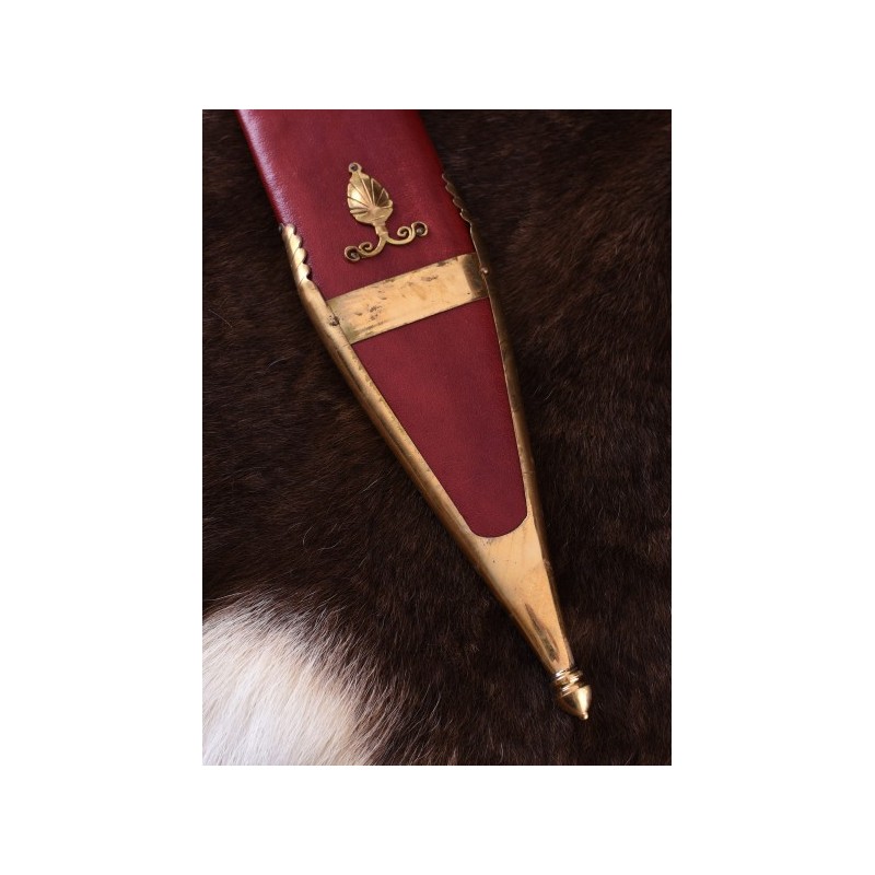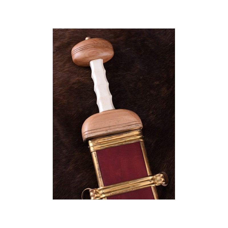 <p>Épée romaine Gladius de type Mayence avec fourreau, premier siècle.</p> <p></p> <p> - Matériau : lame en acier à ressort EN45 (acier au carbone, pas en acier inoxydable), poignée en os, garde et bouton en bois, incrustation et incrustation de protège-main en laiton </p> <p>- Longueur totale : env. 71 cm </p> <p>- Longueur de la lame : environ 53 cm </p> <p>- Épaisseur de la lame : env. 4,5 mm / 2,5 mm (arêtes de coupe env. 1 mm) </p> <p>- Longueur de la poignée : environ 18 cm (section de la poignée d’environ 9 cm) </p> <p>- Largeur maximale de la lame : environ 6,5 mm (arêtes de coupe environ 1 mm). Largeur de la lame : environ 6,5 cm </p> <p>- Centre de gravité : environ 13 cm devant la protection </p> <p>- Fourreau en bois inclus avec étui en cuir véritable et quincaillerie en laiton </p> <p>- Poids sans gaine : env. 0,8 kg </p> <p>- Poids avec étui : environ 1,3 kg Les spécifications ci-dessus peuvent varier légèrement d’un exemple à l’autre. L’acier utilisé n’est pas inoxydable et peut présenter de légers signes de corrosion. Nous recommandons un entretien régulier de la lame et de la gaine, par exemple avec Ballistol, une huile universelle idéale pour préserver les ustensiles en acier.</p> <p></p>