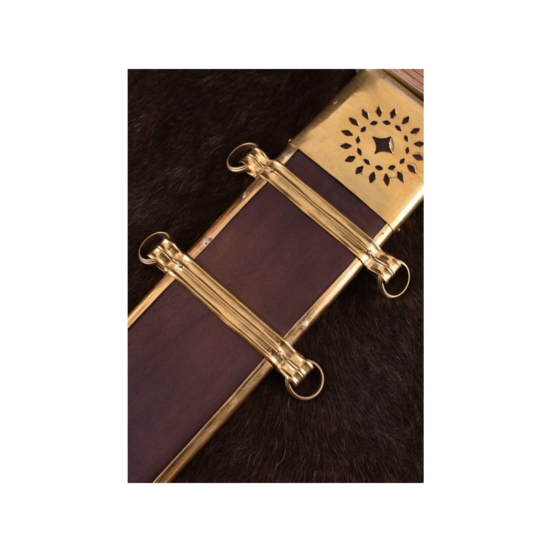 <p>Légionnaire romain Gladius épée avec fourreau, premier siècle.</p> <p></p> <p>- Matériau : lame en acier à ressort EN45 (acier au carbone, pas en acier inoxydable), poignée osseuse, protection et bouton en bois, écrou de serrage en laiton et incrustation de protection </p> <p>- Longueur totale : env. 72 cm </p> <p>- Longueur de la lame : environ 52 cm </p> <p>- Épaisseur de la lame : env. 3,8 mm / 2,8 mm (arêtes de coupe env. 1 mm) </p> <p>- Longueur de la poignée : environ 20 cm (section de la poignée d’environ 9,5 cm) </p> <p>- Largeur maximale de la lame : environ 5,5 cm. Largeur de la lame : environ 5,3 cm </p> <p>- Centre de gravité : environ 10 cm à l’avant de la garde </p> <p>- Avec revêtement en bois avec revêtement en cuir véritable et quincaillerie en laiton </p> <p>- Poids sans housse : env. 0,65 kg </p> <p>- Poids avec housse : environ 1,1 kg Les spécifications ci-dessus peuvent varier légèrement d’une pièce à l’autre. L’acier utilisé n’est pas inoxydable et peut présenter de légers signes de corrosion. Nous recommandons un entretien régulier de la lame et de la gaine, par exemple avec Ballistol, une huile universelle idéale pour préserver les ustensiles en acier.</p> <p></p>