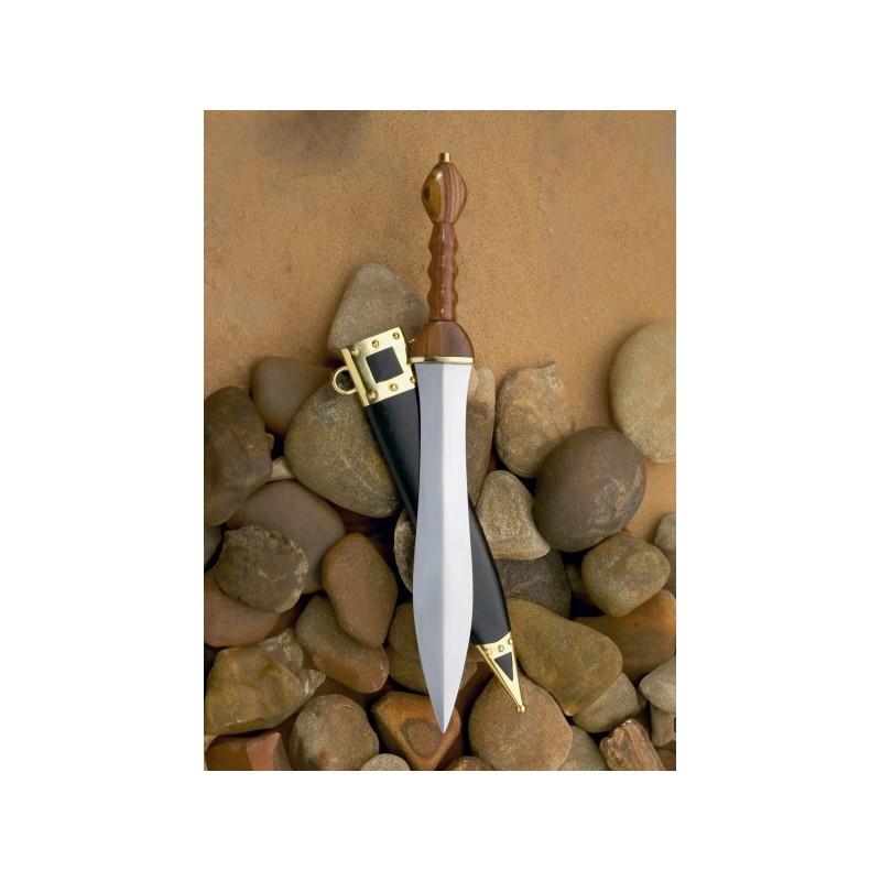 <p>Pugio romain, guindeau</p> <p></p> <p>- Matériau : acier au carbone 1055 </p> <p>- Longueur totale : env. 50 cm </p> <p>- Longueur de la lame : environ 31,5 cm - Épaisseur de la lame : environ 4,5 mm </p> <p>- Longueur de la poignée : env. 9 cm / poignée totale env. 18,5 cm </p> <p>- Largeur max. de la lame : env. 5 cm - Longueur max. du manche : env. 9 cm / manche total env. 18,5 cm </p> <p>- Largeur max. du vantail : environ 5 cm. Largeur de la lame : env. 5 cm </p> <p>- Centre de gravité : environ 5,5 cm (devant la protection) </p> <p>- Comprend un revêtement en bois recouvert de cuir avec des inserts en laiton </p> <p>- Poids sans housse : env. 378 g - Poids avec étui : env. 559 g </p> <p></p>