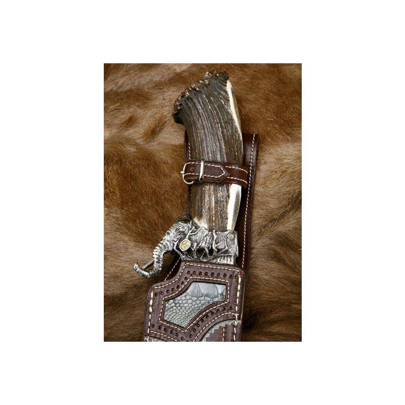 <p>- <span style="color:#000000;">Couteau fabriqué par la prestigieuse marque espagnole Muela.</span><br /><span style="color:#000000;">- Couteau de collection au design élégant et luxueux. Edition limitée et numérotée à 150 exemplaires.</span><br /><span style="color:#000000;">- Manche en bois de cerf avec rosace décorée d’une pièce d’argent sterling.</span><br /><span style="color:#000000;">- Taille de la lame env. 25 cm en acier allié au chrome-vanadium.</span><br /><span style="color:#000000;">- Garde en argent avec relief d’éléphant. Il comprend deux pièces d’or gravées avec le numéro de série et le bouclier Maasaï.</span><br /><span style="color:#000000;">- Lame contre-tranchante concave creusée en trois tables. Comprend une gravure au laser sur les deux faces.</span><br /><span style="color:#000000;">- Comprend une housse en cuir avec un morceau de peau d’autruche.</span><br /><span style="color:#000000;">- Présenté dans un coffret en bois avec des gravures de la série African Safari sur la couverture.</span></p>