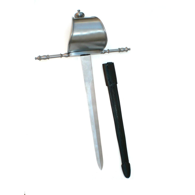 Dague pour gaucher ou miséricorde avec garde lisse et fourreau en cuir noir.