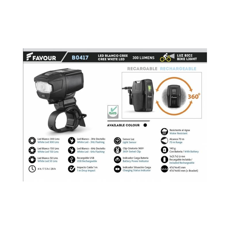 Lampe de poche RECHARGE. VÉLO - 300lm. Noir