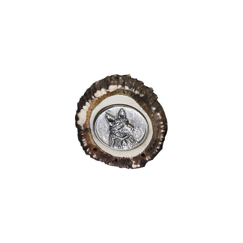 COUTEAU DE CHASSE ET FLEURON PODENCO, couteau « JOYA » pour son travail totalement artisanal et pour les matières premières utilisées. Fabriqué avec une poignée en acier MOVA et en bois de cerf, une garde et une pièce de monnaie en argent sterling, avec incrustation à l’extrémité de la poignée. Accompagné d’une magnifique housse avec des coins de protection en métal.