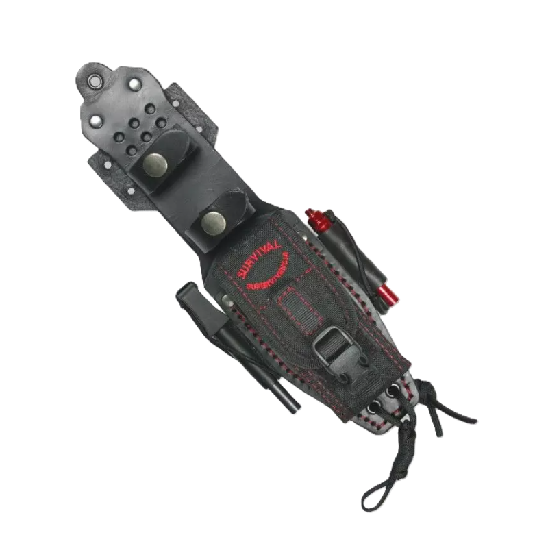 Il coltello ha un'area progettata per fare uso di selce, foro iniziatore per fare fuoco a frizione con arco, foro per corda, rompivetro (merlato), dorso arrotondato per colpire senza danneggiare il bastone e le guancette sono rimovibili (opzione di ricambio).