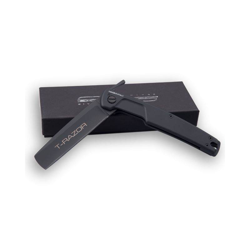 Fino all'inizio del 1900, le persone portavano comunemente coltelli da tasca. Tuttavia, a causa del dilagante "uso improprio", furono approvate leggi per tagliare tutti questi coltelli sulla punta della lama, al fine di ridurre la loro pericolosità come armi. Alcune persone pensavano di ottenere la massima efficacia del bordo da una forma tradizionalmente piatta della lama e sono riuscite a portare rasoi. Pertanto, il rasoio è stato per un certo periodo considerato una temibile arma di autodifesa. Tale "uso improprio" del rasoio comune ha ispirato il nostro design T-RAZOR. Versioni disponibili: T-RAZOR NERO, T-RASO SATINATO.