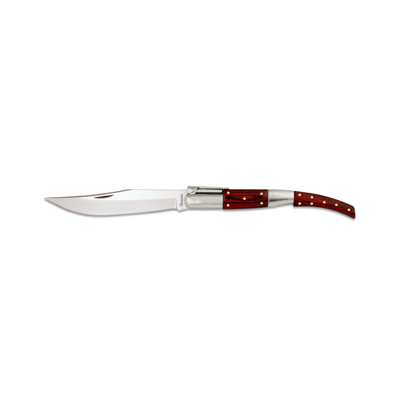 Coltello a cricchetto arabo. Ha una lama di 21,5 cm e uno spessore di 2,20 mm. Il tipo di acciaio della lama è inossidabile e con finitura lucida. Ha un manico di resistenza rosso e la sua lunghezza è di 26,20 cm. La lunghezza totale del coltello è di 48,00 centimetri.