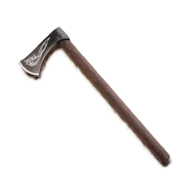 Quest'ascia di ispirazione vichinga è incisa con una testa di drago annodata su una lama di acciaio grezzo e scuro. Manico in legno oscurato, perfetto per il lancio.