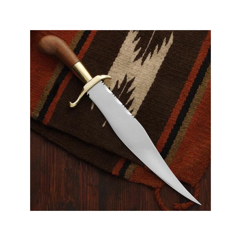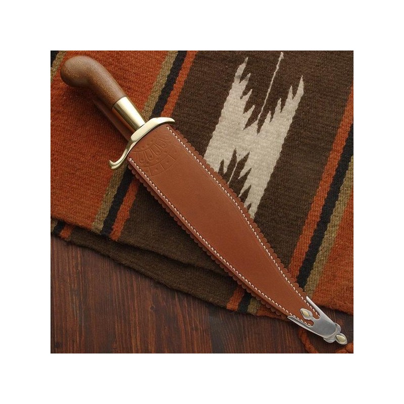 Il Bowie messicano ha un design esclusivo e molto efficace. L'originale di questo Bowie si trova in una collezione privata. Sicuramente lo si poteva vedere nella cintura del generale Santa Anna in una coraggiosa azione alla frontiera. Ha una lama forgiata a mano in acciaio ad alto tenore di carbonio, 1085. Lama a codolo pieno dalla forma unica ed esclusiva con tacche sul tagliente. Manico in legno massello rifinito a mano con paramano in ottone. Comodo e leggero. Un must-have per ogni collezionista.