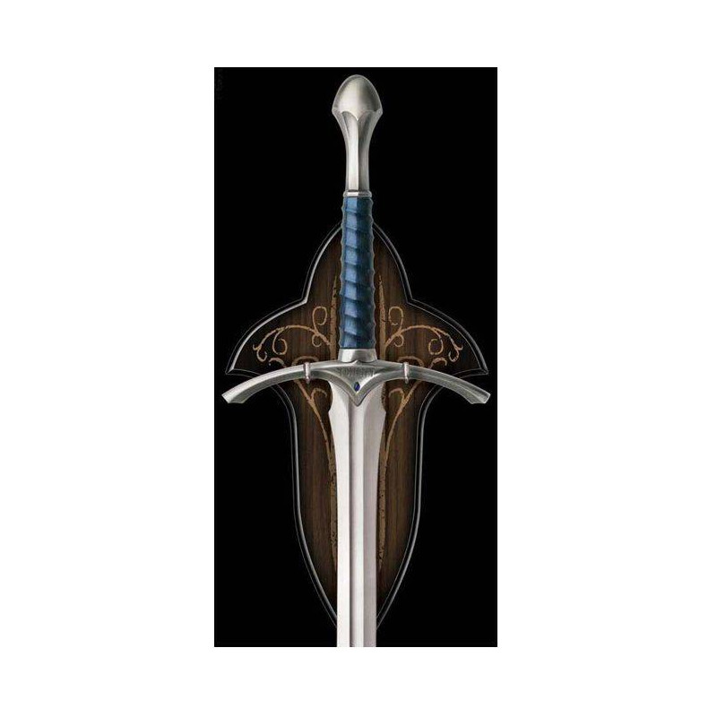Dettagli: - Lunghezza totale: circa 121 cm - Lunghezza della lama: 89,5 cm - Materiale della lama: acciaio inossidabile AUS-6 - Materiale del manico: metallo fuso, avvolto con pietre preziose in similpelle e fornito - Include una piastra decorativa a muro in legno duro. - Ogni spada è accompagnata da un certificato di autenticità. <p style="text-align:justify;"> Si tratta di un'antica spada brandita da Gandalf il Grigio. il potente mago amico di Frodo Baggins. "Glamdring" è una spada magica che brilla in presenza del nemico e serve Gandalf nella sua missione di aiutare la compagnia dell'anello. È stato forgiato dagli antichi elfi.</p>