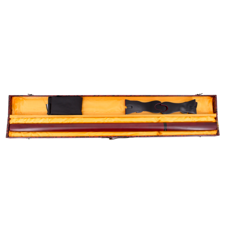 Shirasaya Functional 16863 da 108 cm Lama in acciaio damascato rosso AISI 1045 con doppio filo, con fodero e manico in legno rosso, con supporto in legno e scatola rivestita con tessuto decorativo di presentazione. Codice prodotto: 16863