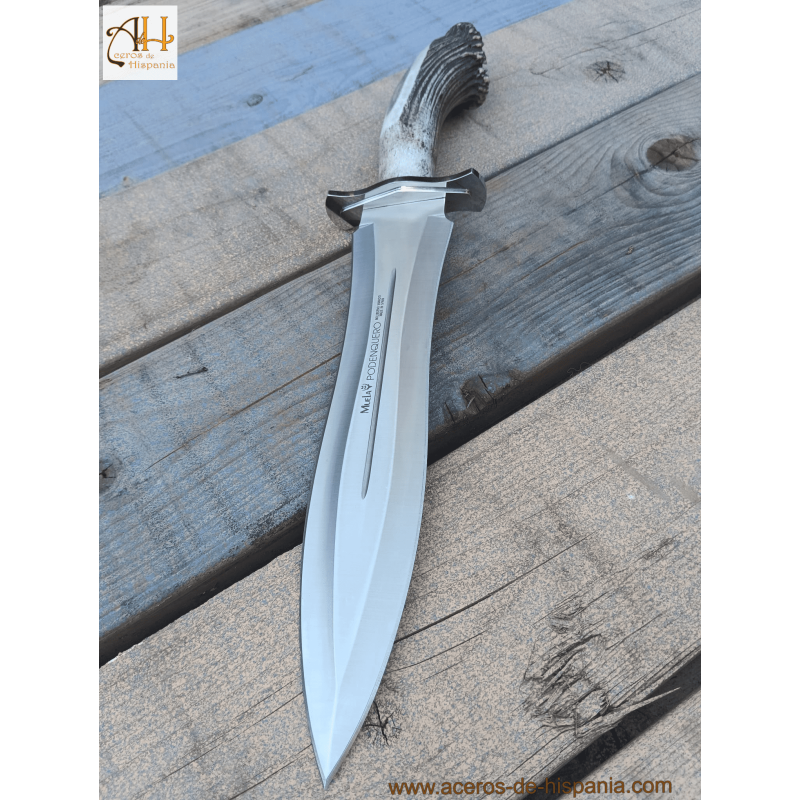 Questo coltello di finitura è dotato di un manico in corno di cervo con rosetta e parafango in ottone, che gli conferisce un aspetto elegante e tradizionale. Il peso di 630 grammi offre un equilibrio perfetto per una maneggevolezza comoda e sicura.