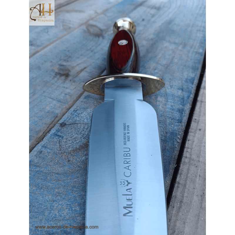<p><span style="color:#000000;">Coltello Muela fatto a mano, modello Caribou. Questo modello fa parte dei coltelli sportivi e da caccia, appositamente progettati per la finitura dei coltelli. Ha una lama in acciaio al molibdeno vanadio da 205 mm con la punta di lancia.</span></p>