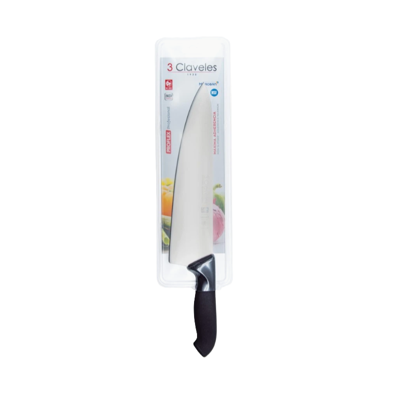 <p>- Coltello da chef.<br />- Acciaio inossidabile, molibdeno vanadio.<br />- Lucidatura opaca.<br />- Elevata adesione.<br />- Maggiore sicurezza.<br />- Colore manico: nero.<br />- Design ergonomico.<br />- Traspirante, leggero e resistente.<br />- Stabile alle alte e basse temperature.<br />- Materiale termoplastico di alta qualità.<br />- Massima igiene.<br />- Alte prestazioni.<br />- Grande durata.<br />- Presentato con copertina in foglio.</p>