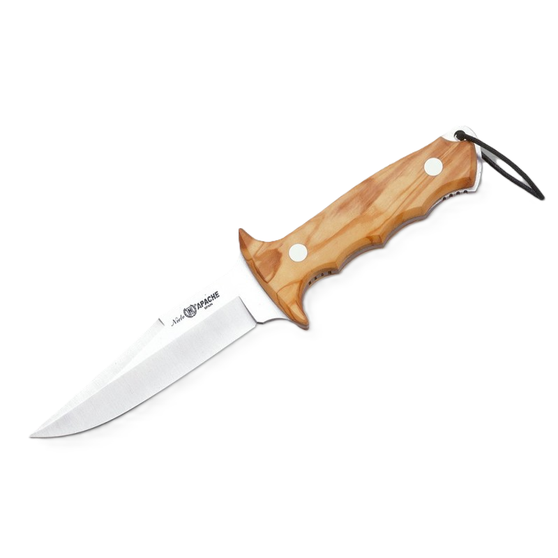 - Lama in acciaio AN58 - Manico in legno d'ulivo. - Custodia in pelle marrone. - Include cordino.